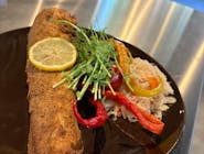 aljašská treska v trojobale, hranolky, tatárska omáčka, zeleninová obloha (1,3,4,5,6,7) -