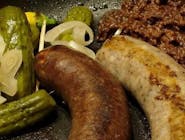 žemľa, majonéza, poľný šalát, hovädzie mäso (150g), grilovaný encián, červená cibuľa, klobása, slanina, piri piri dresing (350g)